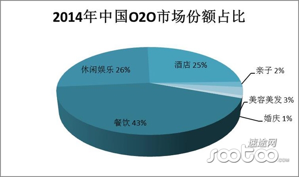 2014年國內(nèi)的O2O市場中,餐飲行業(yè)市場份額占比高達43%,居首位。休閑娛樂類市場份額占26%排名第二,酒店服務(wù)市場份額以微小差距排