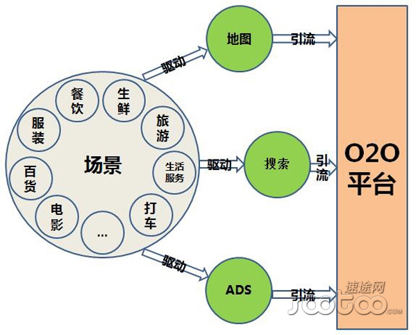 首先,O2O平臺借助地圖、搜索、ADS等的驅(qū)動,將產(chǎn)生用戶需求的場景包括餐飲、服裝、百貨、電影、旅游、生活服務(wù)、打車、生鮮等等引入到了O2O平臺上面來,打通了用戶和O2O平臺之間的供求渠道。即用戶在O2O平臺上可以通過搜索、地圖、ADS等入口,查找自己所需要的服務(wù)類別。